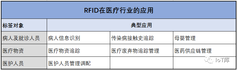 RFID在醫療行業的應用非常豐富,針對不同的對象和場景,有如下表所示應用: